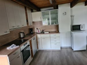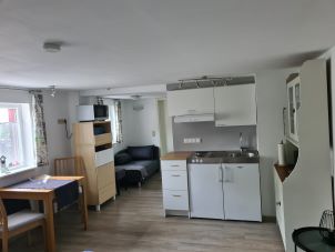Die Kleine (Ebenerdig) Ferienwohnung ist mit Kühlschrank - Gefrierfach,zwei Kochplatten und Micro.-Backkombi ausgestattet und verfügt über SAT-TV, im Duschbad sind Fön und Seife vorhanden.